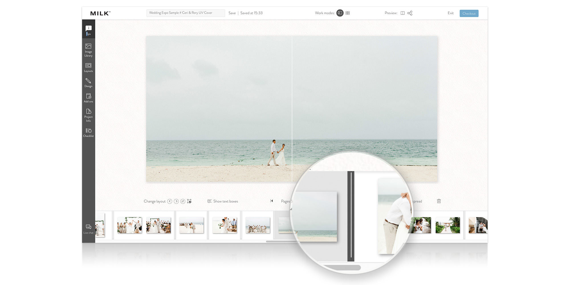 Upload your photos into our easy-to-use Design Studio and get started. We recommend our "image slicing" function. Simply click to the right of any number of images in the strip at the bottom of your project and it will assign them to a spread. You can add one to twelve images per page in most MILK formats. From there, all that's left to do is select from our designer layouts and click to adjust the images within the frames.